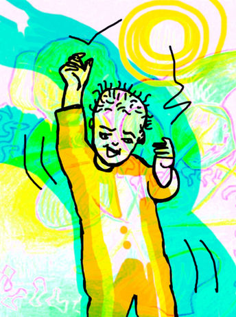 Figuration in Farbe, Fantasiefigur in Kleidung, bloßer Klecks in Knete. In Form gefasst, aus Form entlaufen. Analog-digitale Haptik, Collagen-Optik. Installation einer Kunstproduktion.