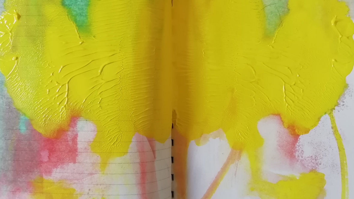 Figuration in Farbe, Fantasiefigur in Kleidung, bloßer Klecks in Knete. In Form gefasst, aus Form entlaufen. Analog-digitale Haptik, Collagen-Optik. Installation einer Kunstproduktion.